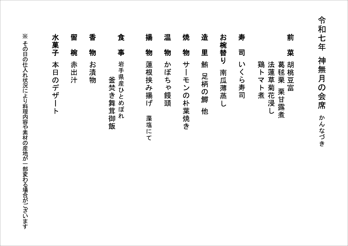 木々の実り豊かな神無月の候、厳選した秋の恵みを取り入れたお料理の数々をご用意いたしました。宝石のように輝くいくら寿司、香ばしい朴葉の薫りをまとったサーモンの朴葉焼き、ほっくり甘いかぼちゃ饅頭、舞茸の風味豊かな岩手県産ひとめぼれの釜炊き御飯など旬の味覚を心ゆくまでご堪能ください。